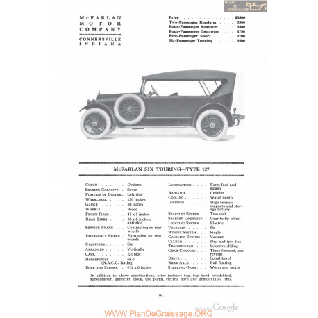 Publications de documents anciens et introuvables sur nos véhicules Oldtimers, des plans, fiches, schémas de graissage, lubrication charts, des fiches descriptives, des fiches techniques, des informations pour le réglage moteur pour Mc Farlan Six Touring Type 127 Fiche Info 1918 Information de WWW.ARCHIVE.ORG, Scanning Google