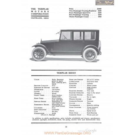 Publications de documents anciens et introuvables sur nos véhicules Oldtimers, des plans, fiches, schémas de graissage, lubrication charts, des fiches descriptives, des fiches techniques, des informations pour le réglage moteur pour Templar Sedan Fiche Info 1920 Information de WWW.ARCHIVE.ORG, Scanning Google