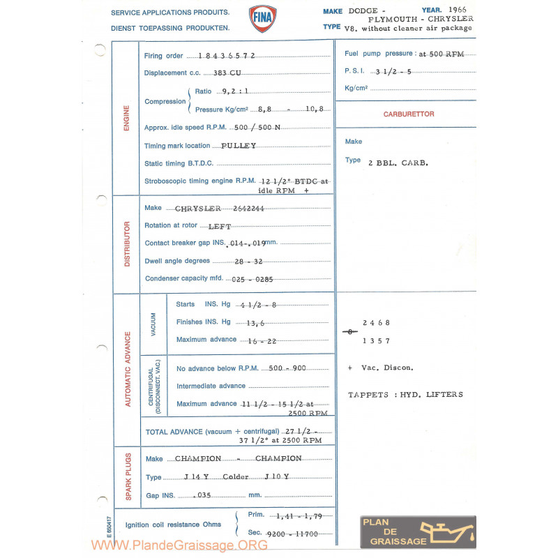 Publications de documents anciens et introuvables sur nos véhicules Oldtimers, des plans, fiches, schémas de graissage, lubrication charts, des fiches descriptives, des fiches techniques, des informations pour le réglage moteur pour Dodge Plymouth Chrysler V8 383 Cu Pulley 1966 Fina